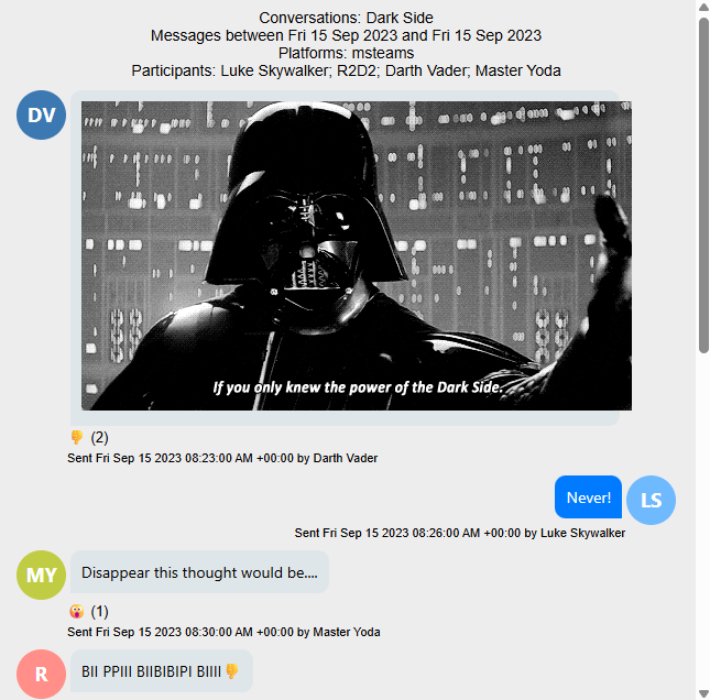 Beim Exportieren in das EML- oder NEML-Dateiformat mit einem ReadySuite Chat-Projekt werden jetzt Reaktionen unterstützt. Jede Reaktion wird unter der jeweiligen Nachricht mit der Anzahl der Teilnehmer, die reagiert haben, angezeigt. Wenn Sie den Mauszeiger über die Reaktion bewegen, werden die Namen der Teilnehmer für die Reaktion angezeigt.