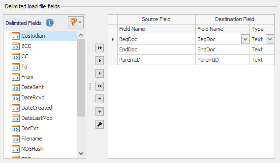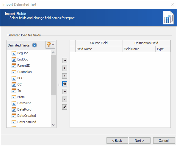 A significant change we’ve made is the field selection process. We redesigned the original grid list over to our new field map selection process. By default, the left-hand side lists all fields found in the delimited load file. You can select the fields to import by moving them over to the right-hand side. There are arrows for moving one, multiple, or all fields to import at once. This process removes the original method of ignoring fields by selecting “Skip” for each field.