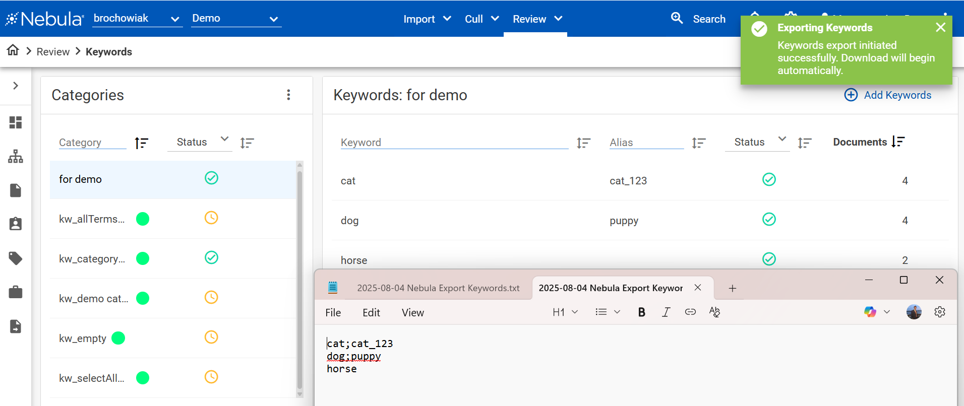 Exporting keywords allows users to quickly iterate and recreate categories without having to run and convert a full-blown keyword report .csv. This saves tons of time and effort for legal teams using ECA, iterating on term variations, or working across multiple matters.