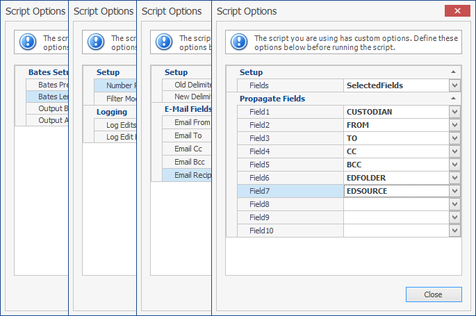 This functionality existed with 'Batch Update' if the 'Propagate to Family' option was turned on. However, updating more than 1 field at a time was tedious to perform. Using the new Propagate Fields script, you can select either 'All Fields' or up to 10 fields at a time to apply parent metadata to attachment/child metadata.