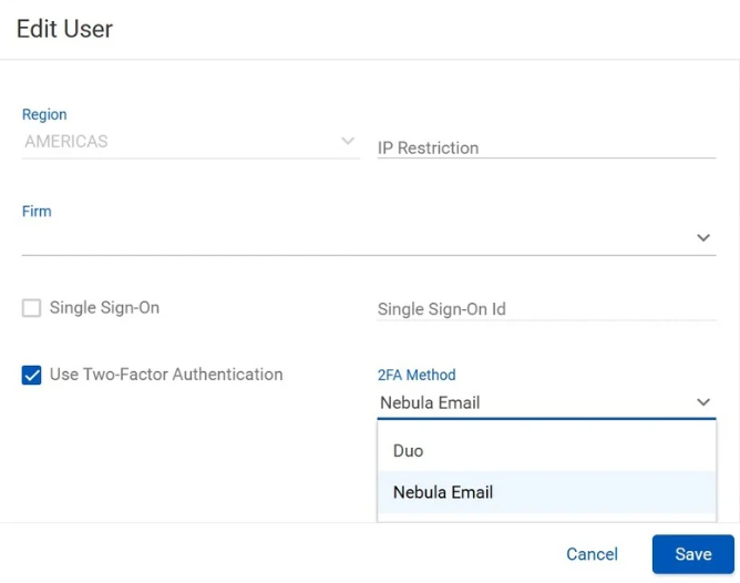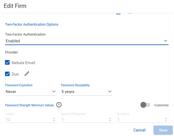 管理者はSettings > Firmsに移動してMFAオプションを設定します。DuoとEメールは個別に、または一緒に有効にすることができます。2FAがRequired(必須)に設定されている場合、そのファームのすべてのユーザーは、承認された方法のいずれかを使用しなければなりません。2FAが単に有効になっている場合、ユーザーはプロフィール上でオプトインできます。
